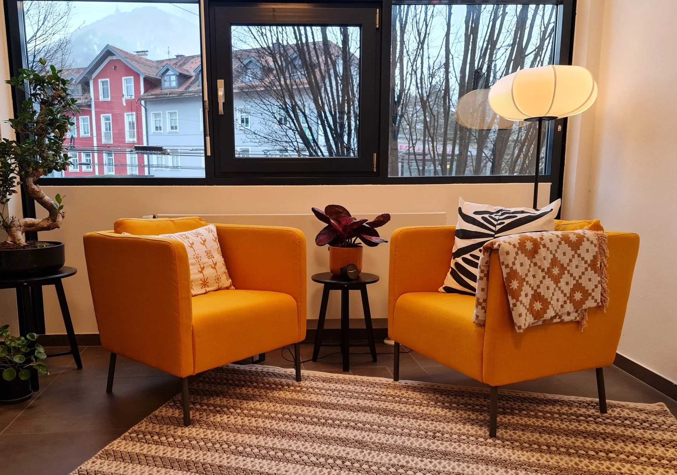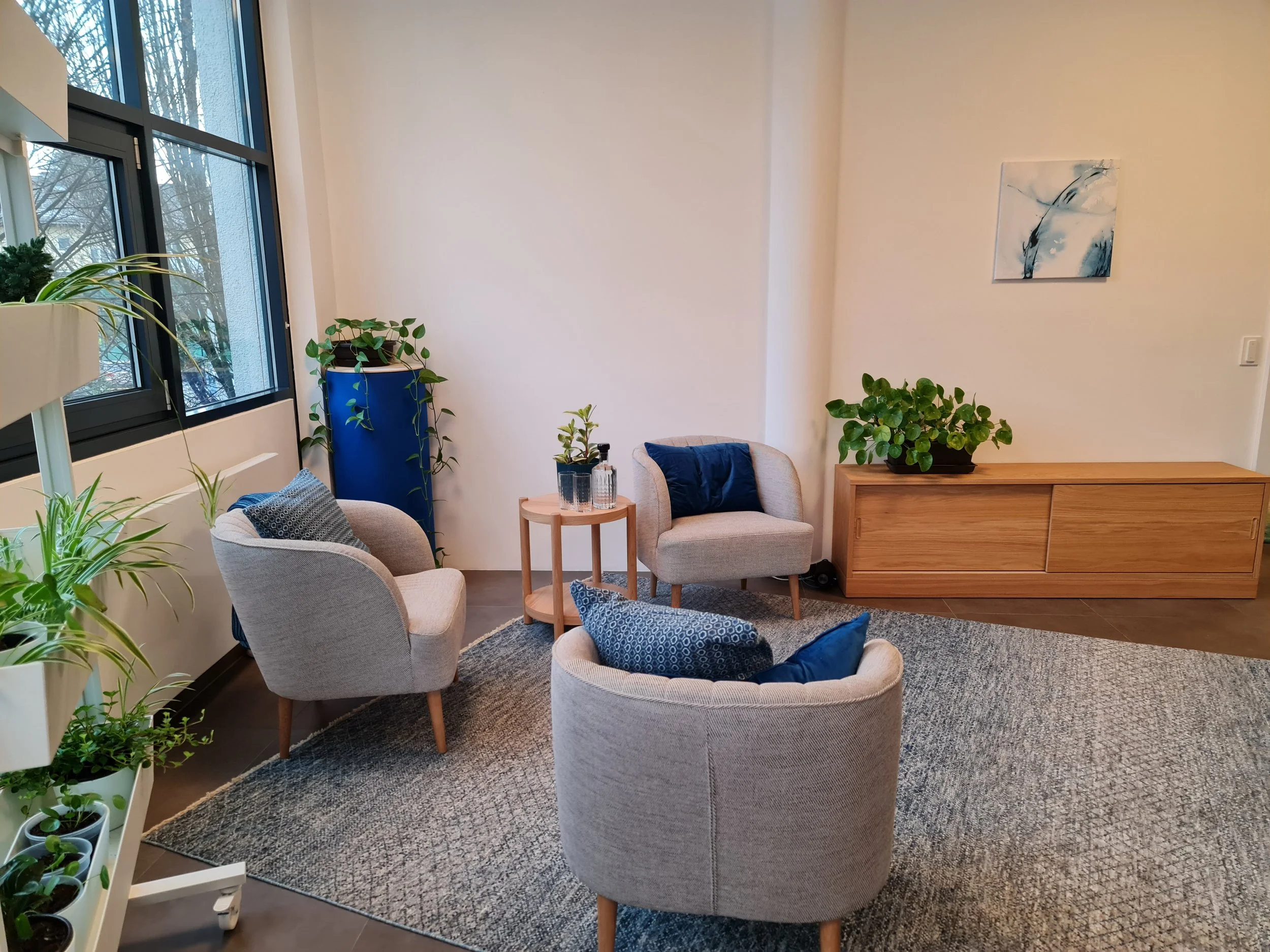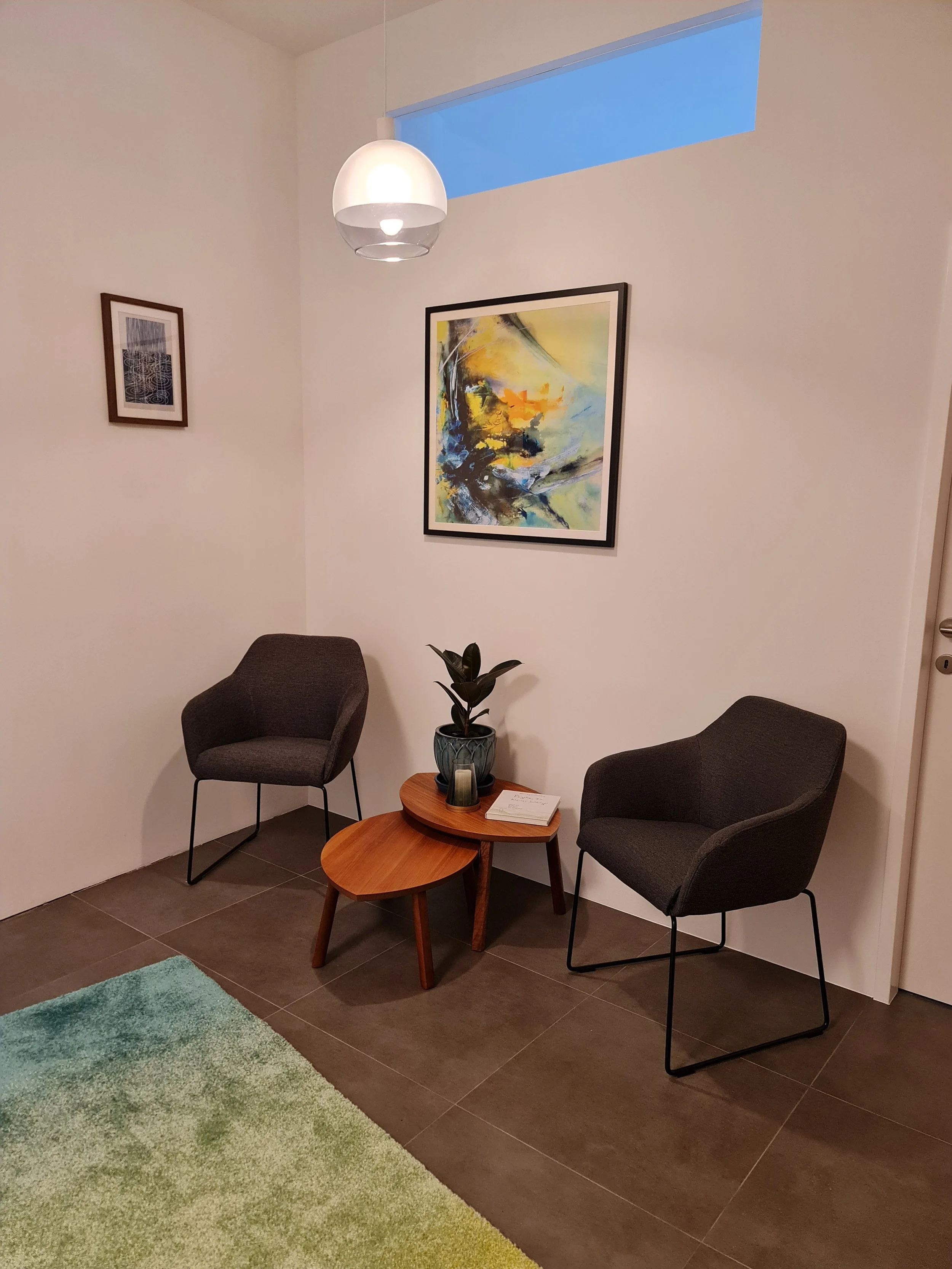 Kleiner Beratungsraum der ideal für Gespräche, Einzelarbeit und Psychotherapie geeignet ist. Ausgestattet mit zwei sehr bequemen Stühlen, heimelig-beschützendes Raumgefühl.